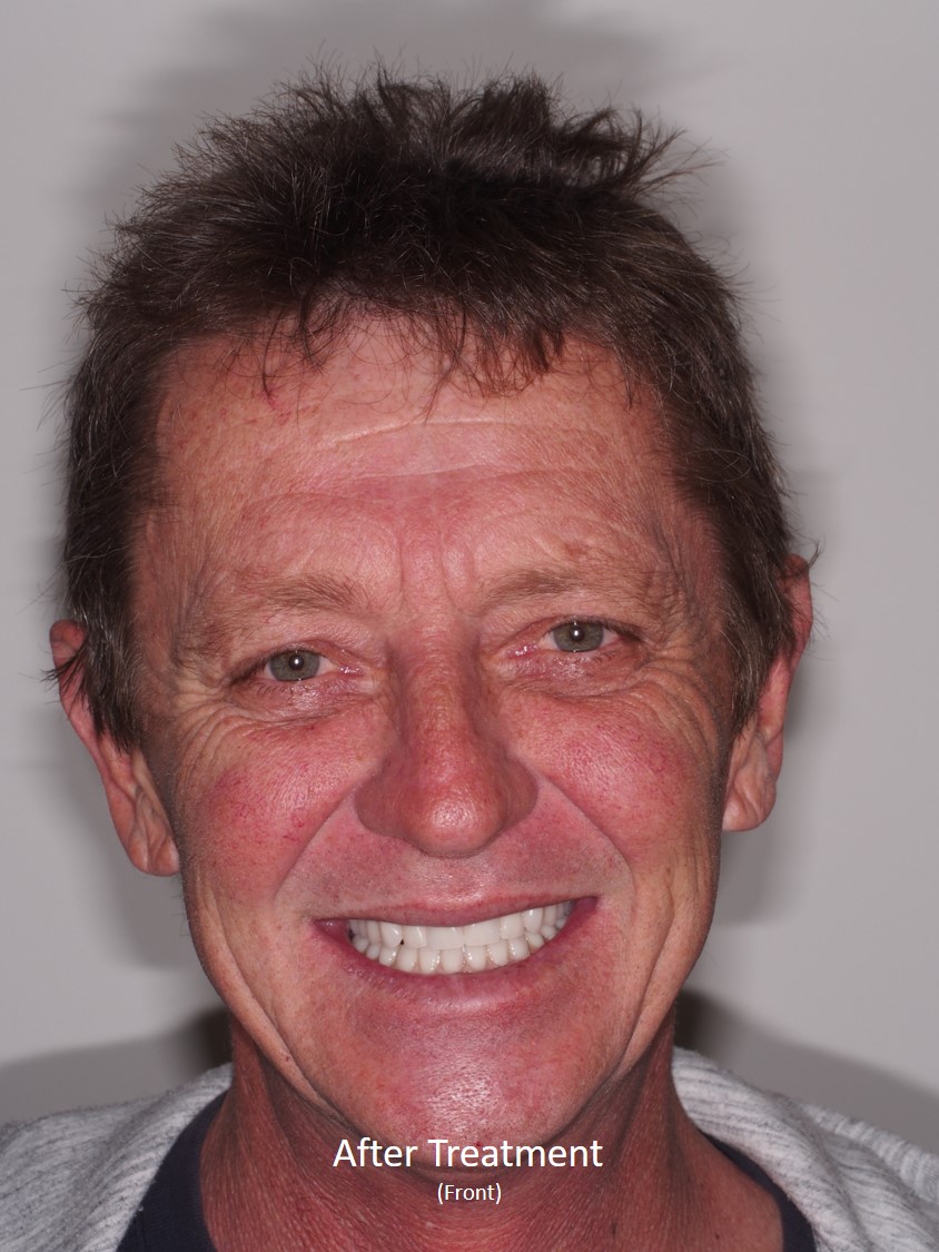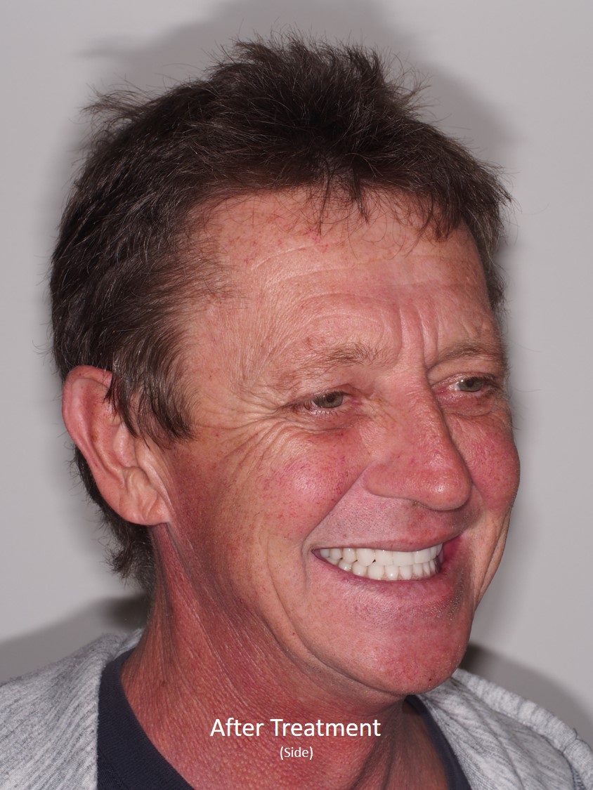 Look at JE’s new smile – JE can now eat, speak and function with overdentures that do not move and are extremely stable in the mouth.